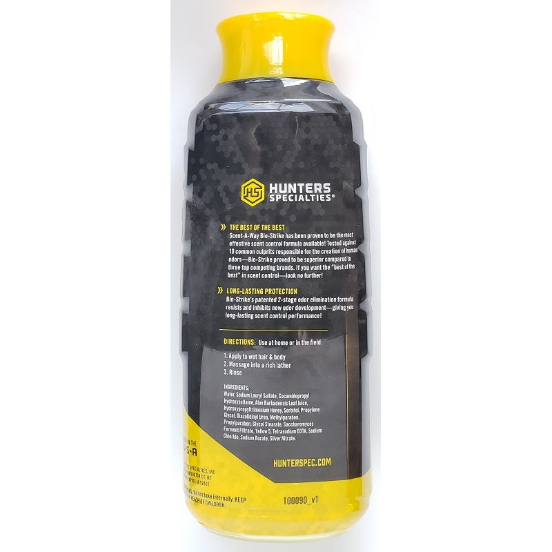 Shower with Scent-A-Way Bio-Strike Body Wash & Shampoo prior to going afield. Cleans & hydrates skin & hair. 24oz cap bottle. Perfect for whitetail deer, mule deer, elk, moose, caribou and predator hunters.