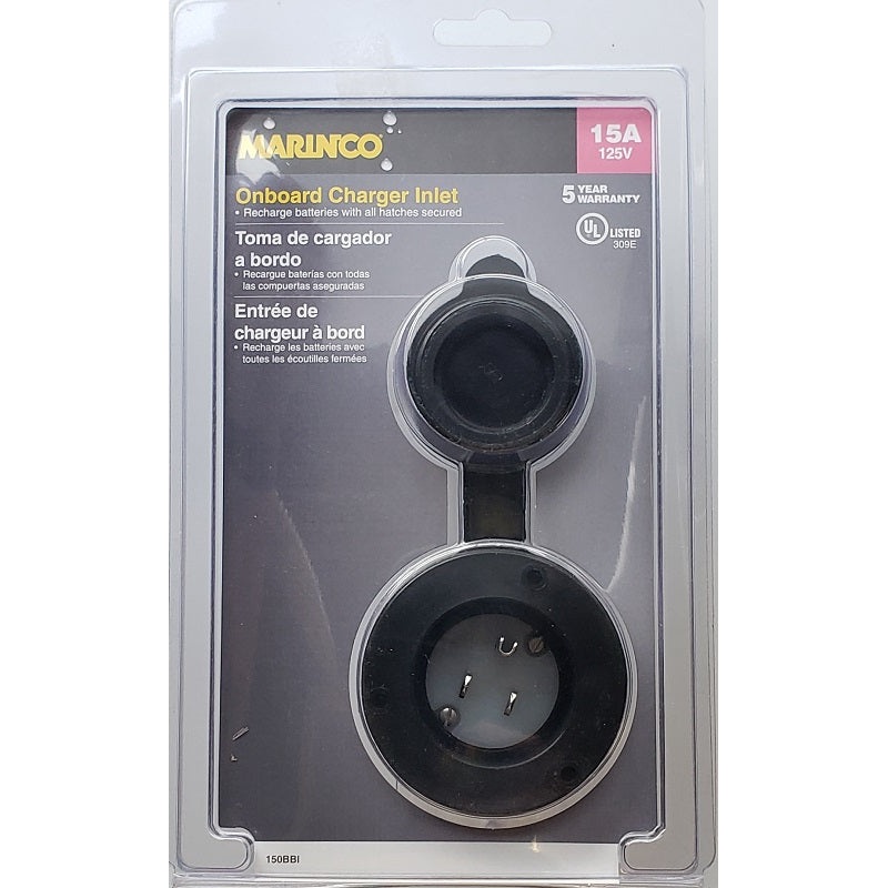 Black 15 Amp 125 Volt On-Board Charger Inlet; Marinco on-board charger inlets make battery charging through an on-board battery charger safer and more convenient. Inlets mount on the boat exterior and are hard-wired directly to the charger. To use, just open the flip lid cover and plug an extension cord into the inlet. All hatches remain closed and locked throughout the charging cycle for added security. Can be mounted almost anywhere on boat. Low-profile cap won’t catch fishing line. Mounts easily to fiberglass & aluminum hulls. Perma-Lock terminals & color-coded wire entrance holes make wiring easy. UV-resistant housing & cap.