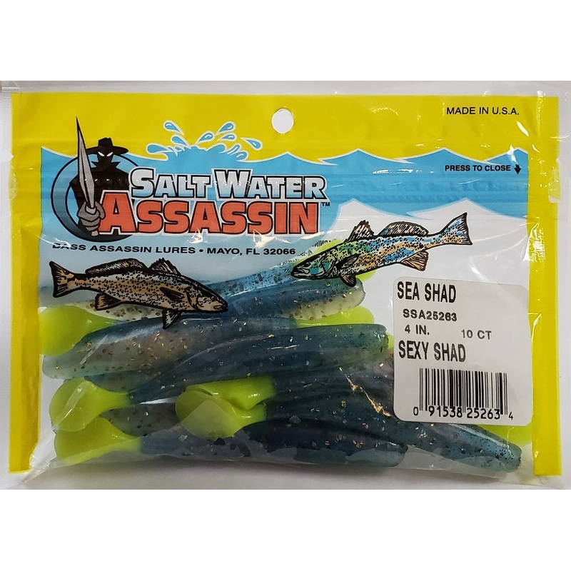 TheSaltwater Assassin Sea Shad Assassin has a popular paddle tail design that’s molded in a softer plastic, which means fish will hold on longer. For best results, use with a jighead.Made in USA.